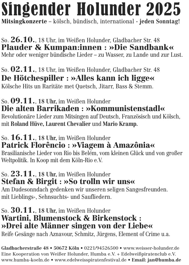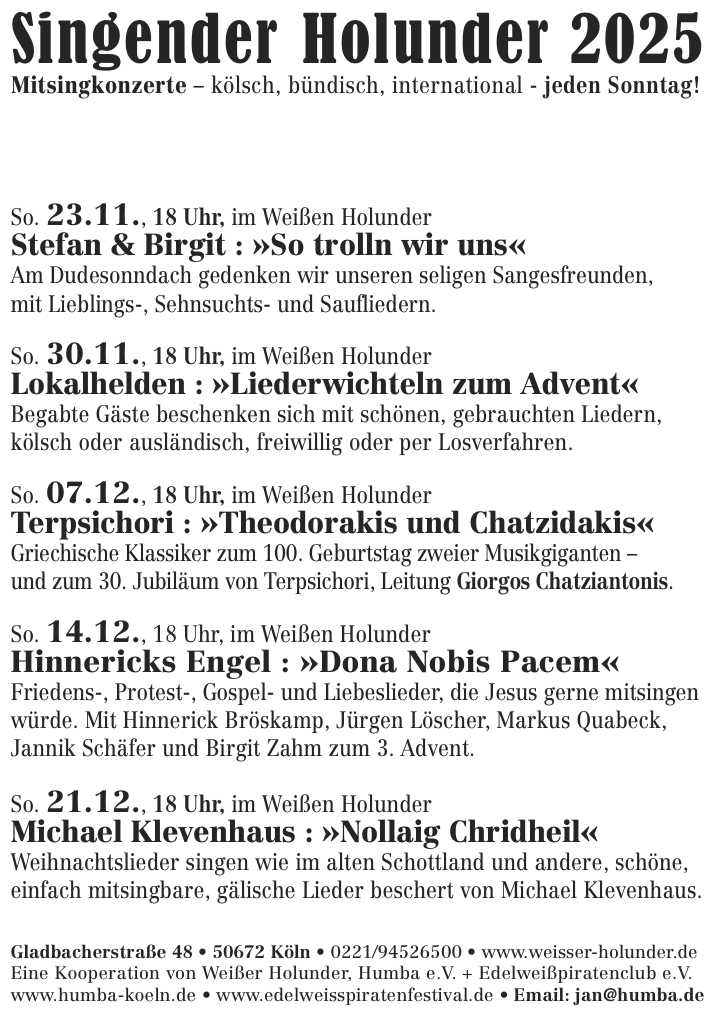 So. 17.11., 18 Uhr, im Weißen Holunder, Gladbacher Str. 48